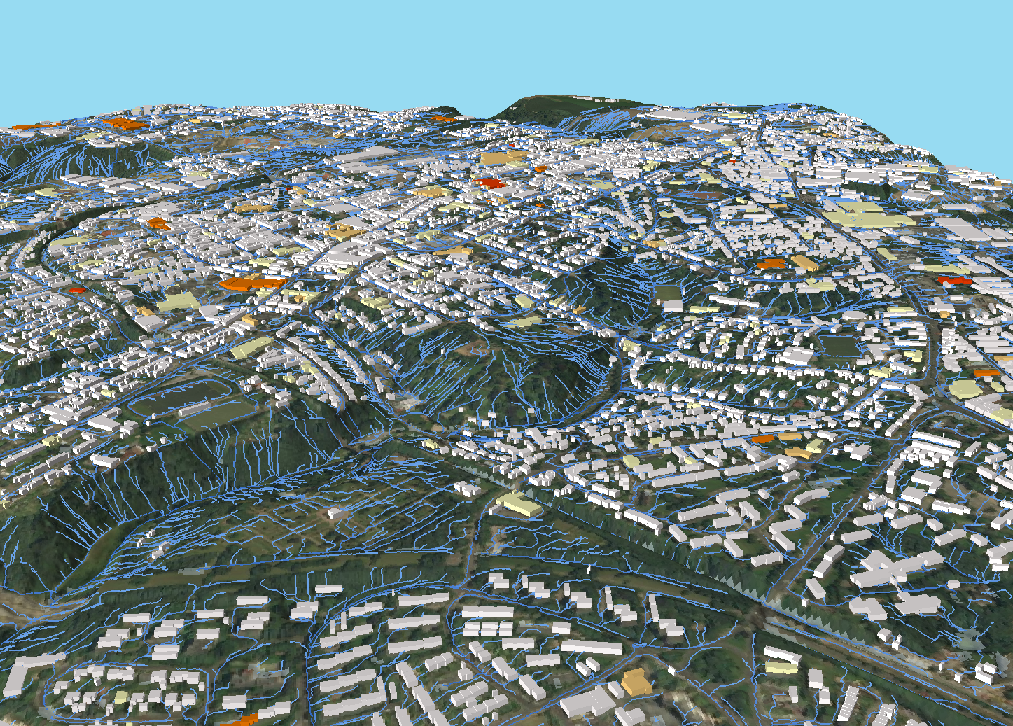 The basis for such simulation models is the digital terrain model with topography, land use, surface condition and other parameters. Using a two-dimensional, hydrodynamic numeric surface run-off model, the drainage routes, flood extents, speeds and flood depths are calculated. The result is intense rainfall risk maps.