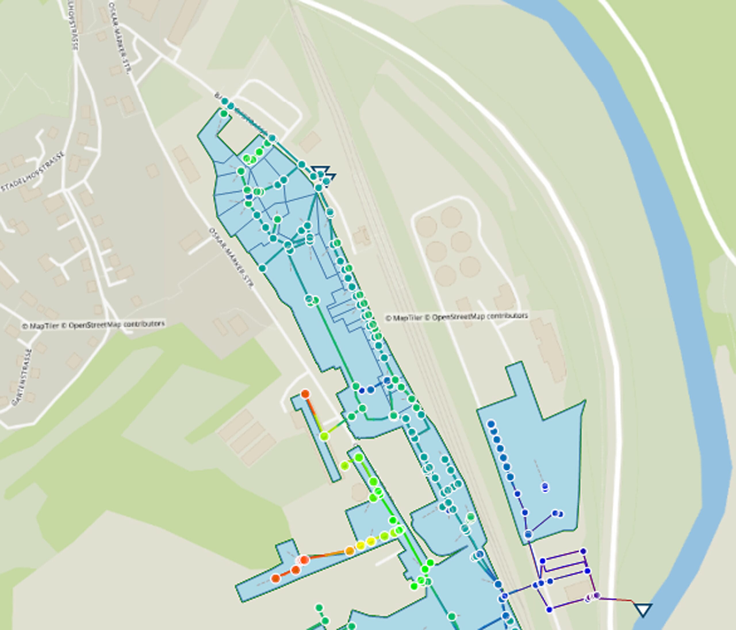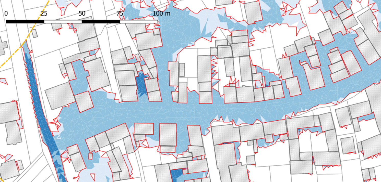 The flooding depths and flow speeds on the property are used to determine the danger. Then it is a matter of blending the flood zones with the properties at risk. The results of the flood risk are compiled with possible damages and vulnerabilities. Areas and properties especially at risk must be identified: How high is the potential damage? Is there a nursery school in the flood zone?