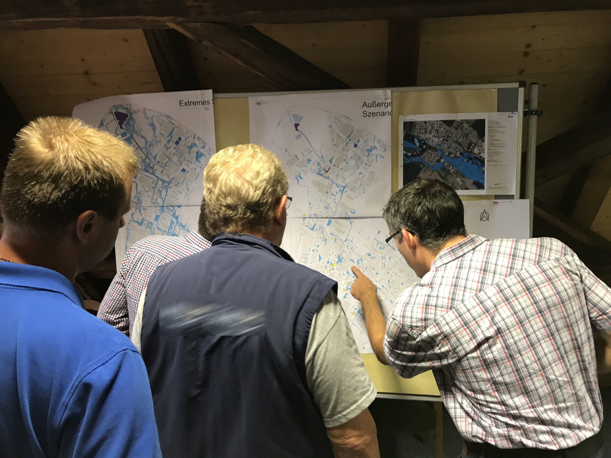 An initial estimation of potential hazards from heavy rain and flash flooding is made by inspecting the municipal territory together with representatives of the relevant authorities. Here, the focus is on questions regarding the starting points of the last floods and the location of flood zones and sites where the greatest damage occurred. If there have been no intense rainfall events in recent years, then, for example, historical records can be used and witnesses from that time questioned.